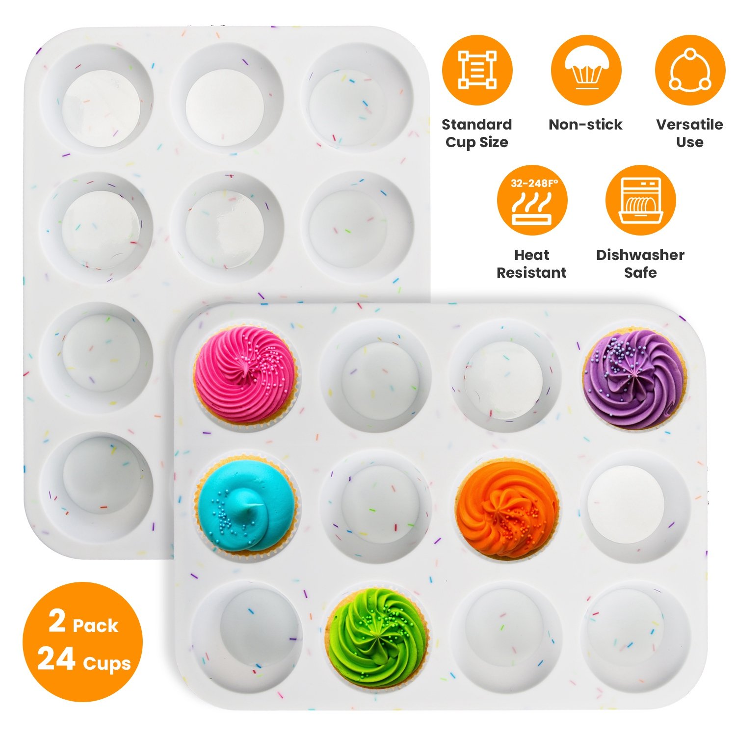 Give your loved ones delicious dessert treat with our muffin pans! Crafted from premium silicone and Coming with total 24 cups, our cup cake molds can prepare numerous muffins or cupcakes at once, ideal for family gatherings, parties, or batch baking for commercial purposes. The polished surface makes muffins pop out easily once pressing finger from bottom. 32℉-248℉heat resistant, safe for oven, microwave, fridge, freezer and dishwasher. Perfect for making muffins, cupcakes, egg tarts, fruit pies, cheesecake etc.. Have a nice baking time with our 12 cup nonstick muffin pans!