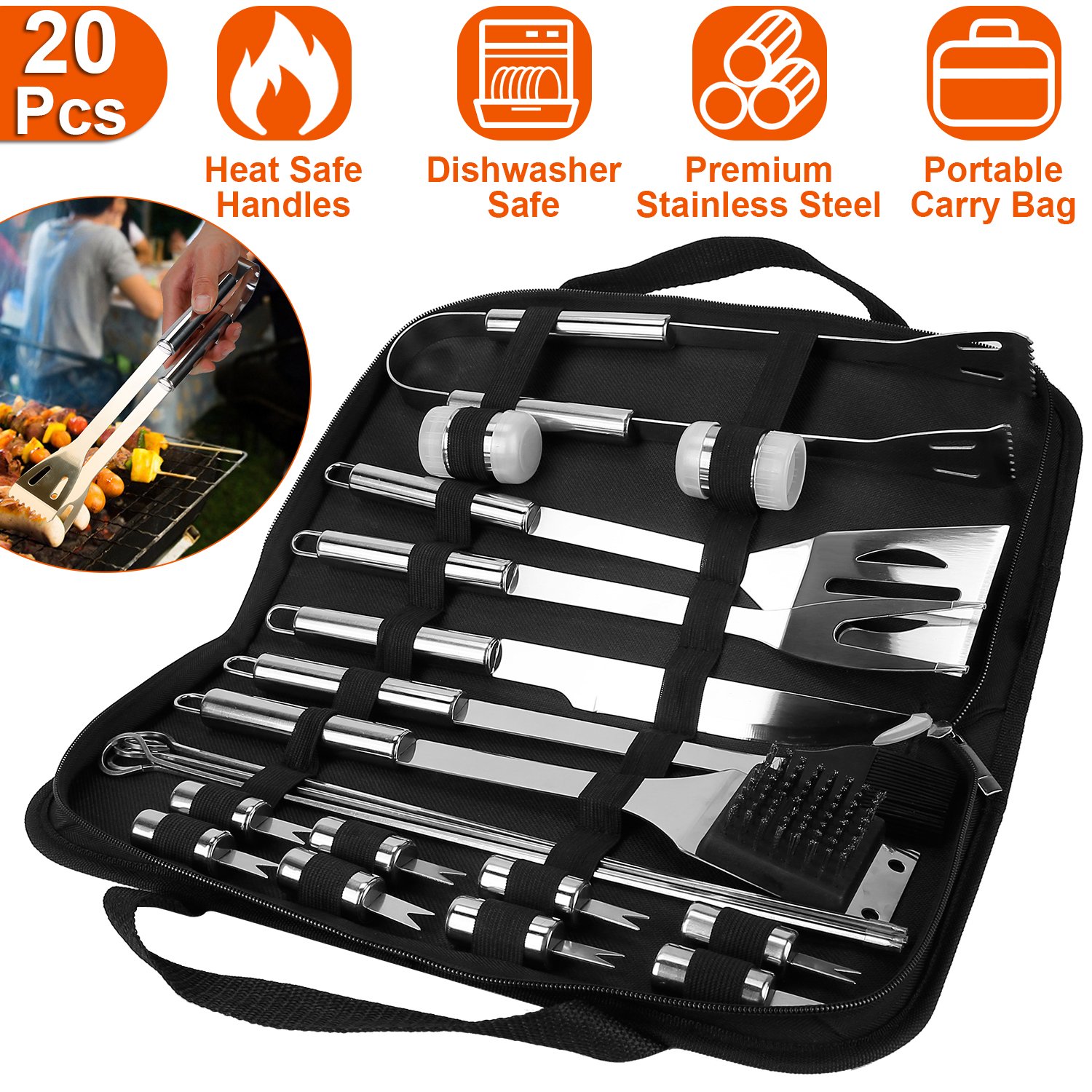 Each BBQ tool has been specifically designed for ease of use and comfort. Ergonomic grips and exquisite balance will make them feel like an extension of your arm. With these 20pcs BBQ tools, you can flip, skewer, and drag food like a real barbecue master. Made of premium stainless steel materials, they are won’t rust and crack, easy to clean and dishwasher-safe. BBQ tools set in a portable bag allow more convenient outdoor cooking. It is a perfect gift for you and BBQ lovers, an ideal choice for Fathers' Day, Christmas, Birthdays and more.