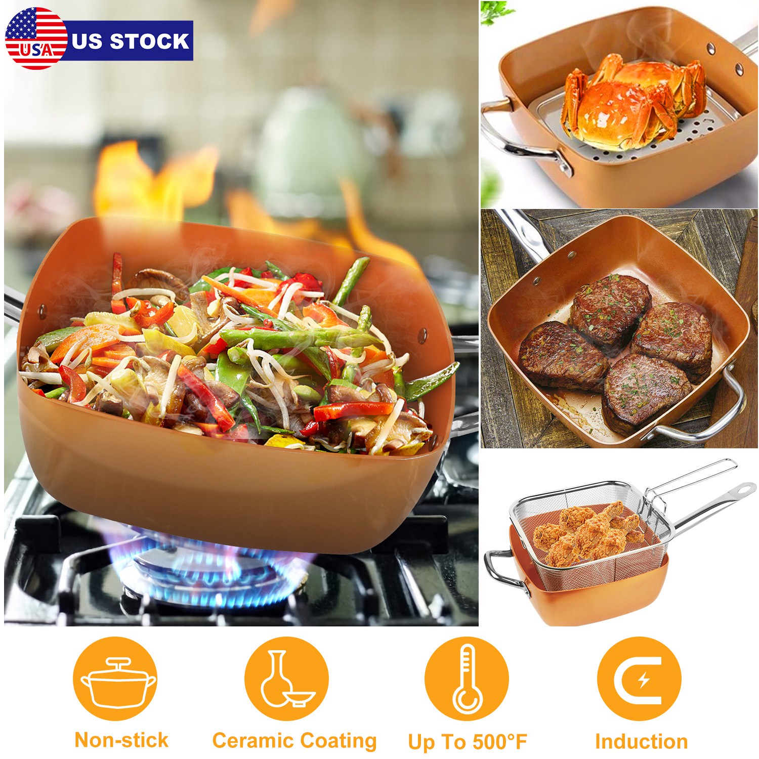 This multi-function frying pan with induction bottom is ideal for electric, induction and gas stoves. You can use it to fry, boil and steam food as you prefer owing to the accessories attached, and cook the food completely in one pan due to the deep sides. The ceramic coating free of PTFE, PFOA and PFOS makes for non-stick and easy cleanup. Fast heating and cool down helps save the cooking time.