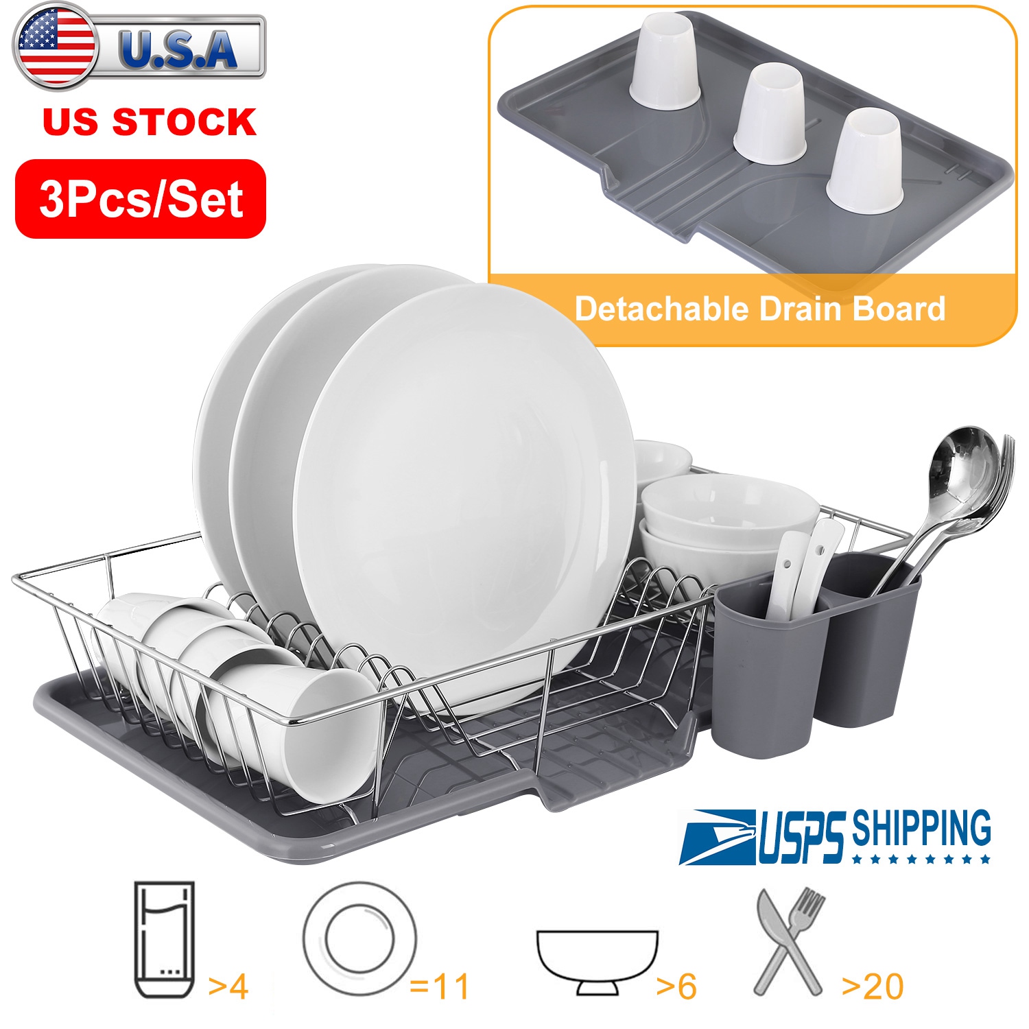 3Pcs Dish Drainer Drying Rack Set Kitchen Dish Rack Countertop Storage Rack w/ Plastic Cutlery Holder Drain Board