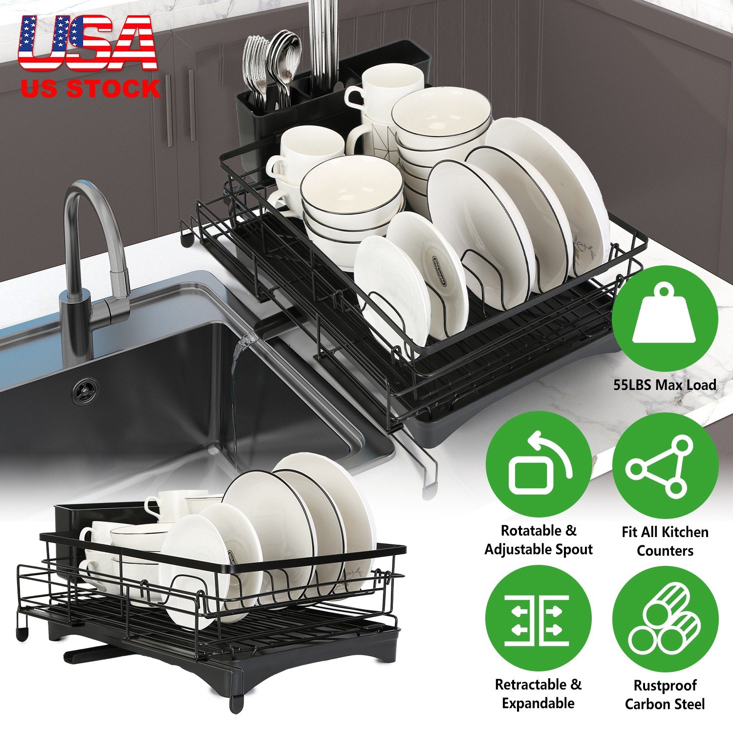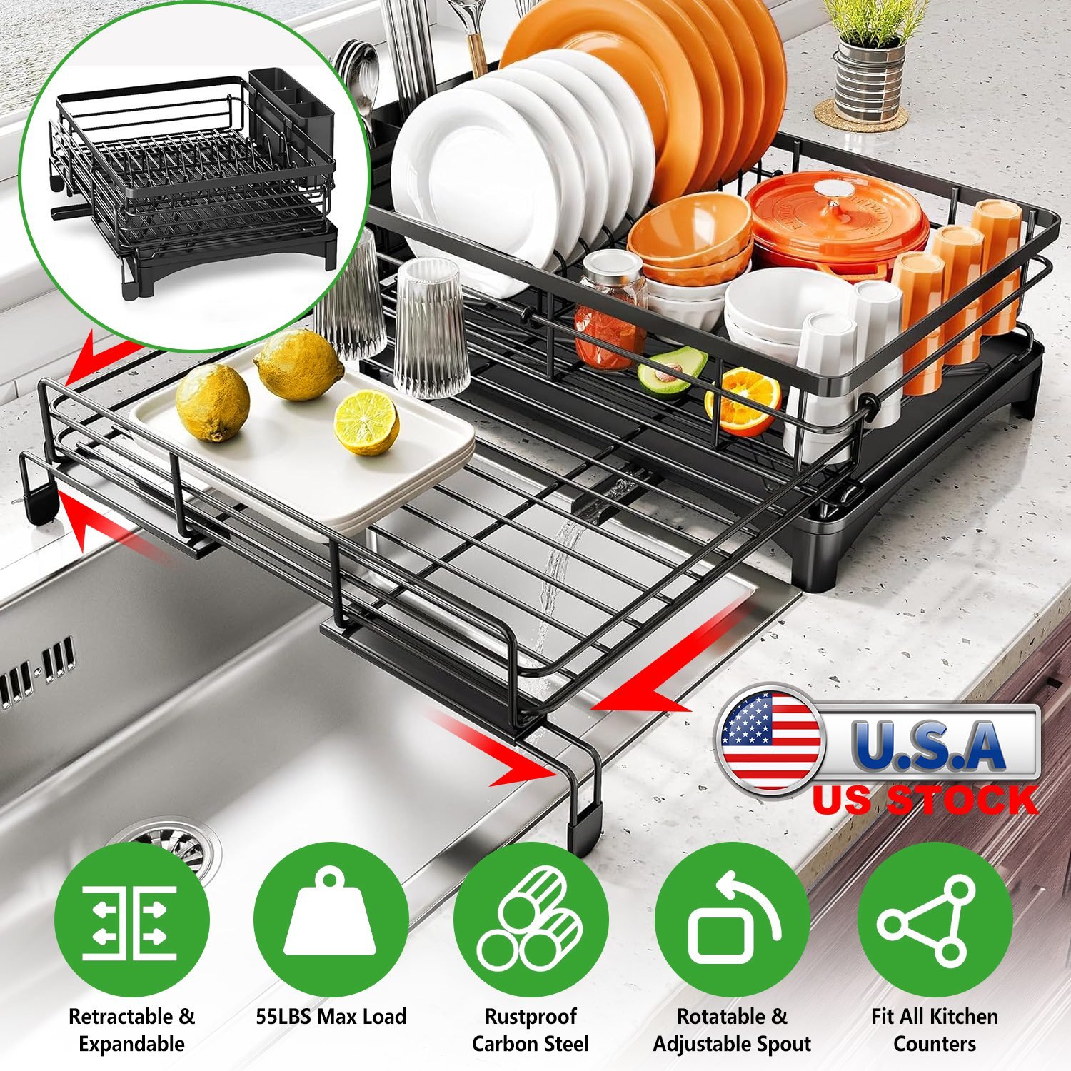 Keep your kitchen counter tidy and well-organized with our extra large dish drying rack! Our expandable dish drying rack features retractable design which not only provides extra large capacity to dry tableware of varies sizes such as plates, dishes, mugs, pot lids and bowls, but also can retract to save 45% space when not in use. Able to fit all kitchen counters and sinks with extendable feet. Rustproof and sturdy enough to bear 55lbs weight. Come with a drainboard that features 360º rotating and length adjustable water spout for automatic drainage. Also include a dish rack and a utensil holder, streamline your life.