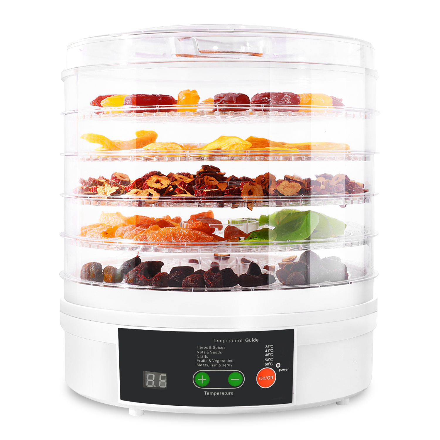 Featuring 5 temperature settings and timer up to 48 hours, this food dehydrator enables you to dry a variety of foods, such as fruits, vegetables, bread chips, herbs, seeds, nuts, meats etc.. 5 stackable clear trays for saving space and process monitoring. 345W pure copper motor for 360° hot airflow and even heating for each layer. Widely used for daily tea bags, healthier snacks, breakfast and picnic preparation, pet treats, cooking spices and so on. Eat healthier with our food drying machine!