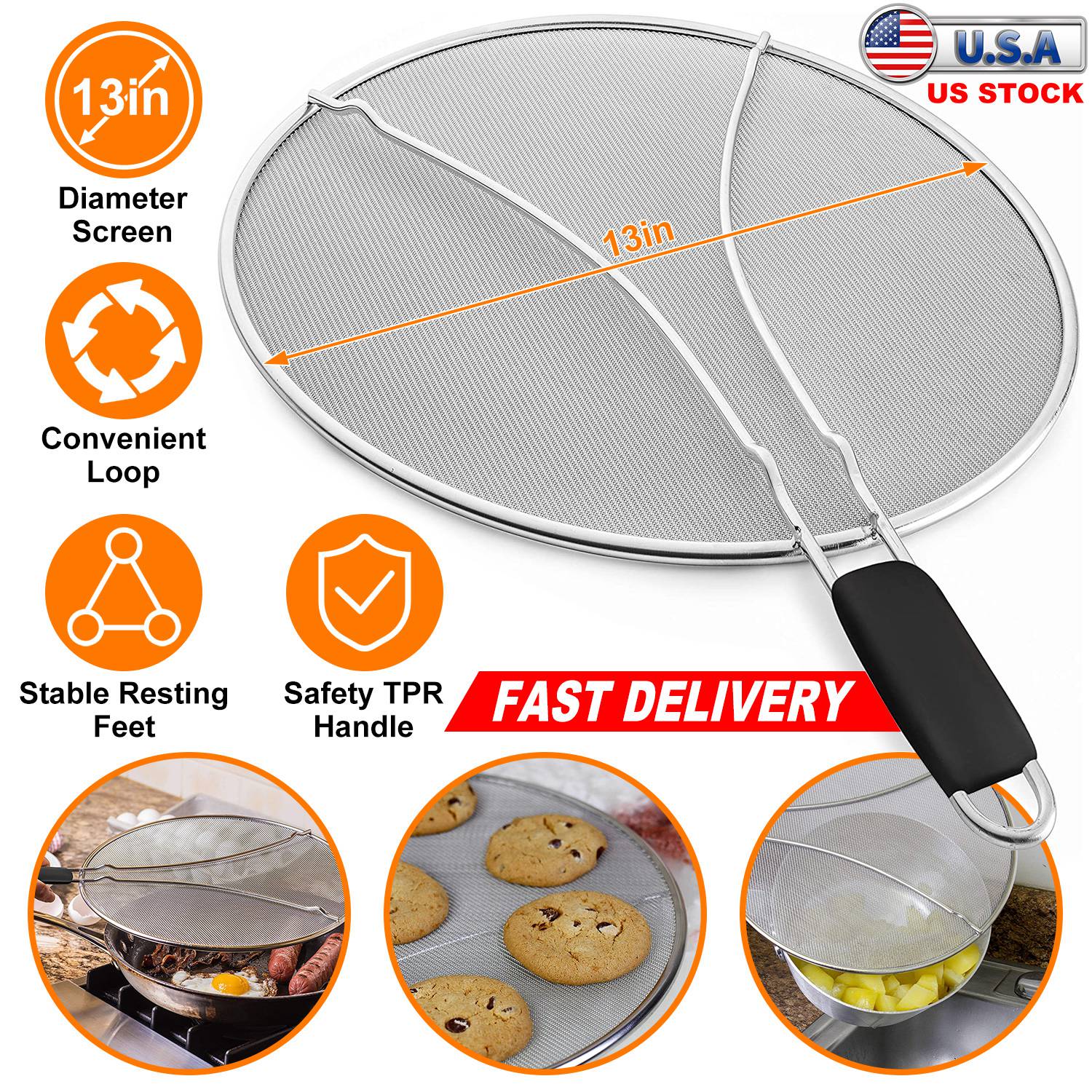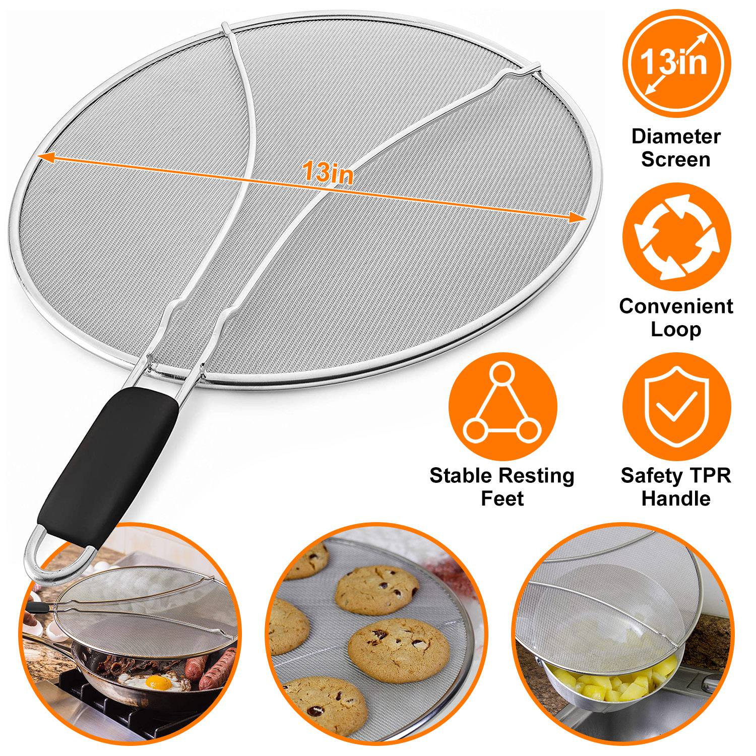 Our Splatter Screen can be used as a fine mesh strainer, steamer, a cooling rack and also used as a splatter screen guard to prevent dangerous hot cooking oil, grease, boiling water and food particles from splashing and splattering. With a suitable TPR 5.9in-handle, you can easily cover your frying pan. It works great for woks, cast-iron skillets, pots, pans, & bowls up to 13in in diameter when fry bacon, chicken, and so on.