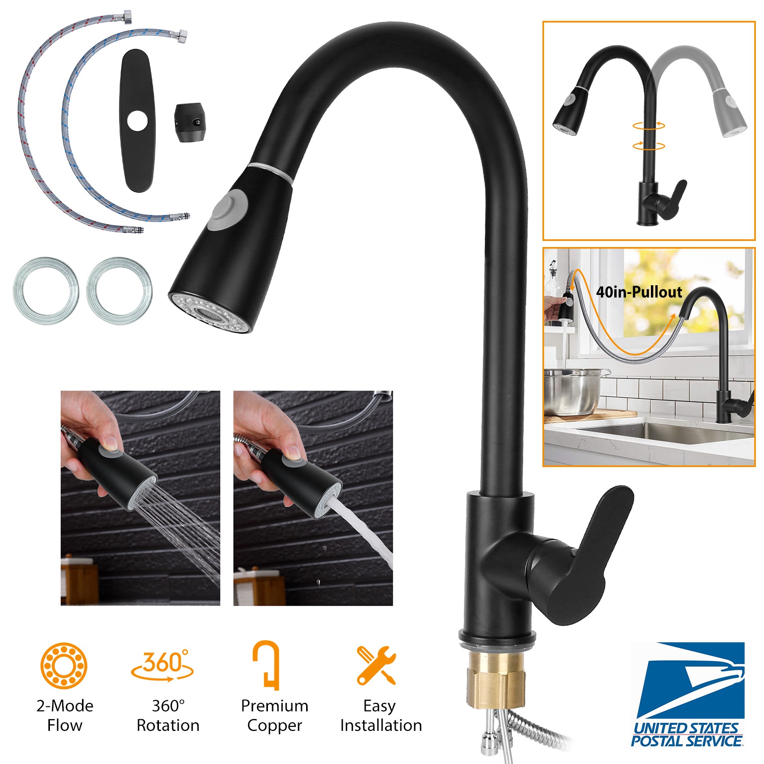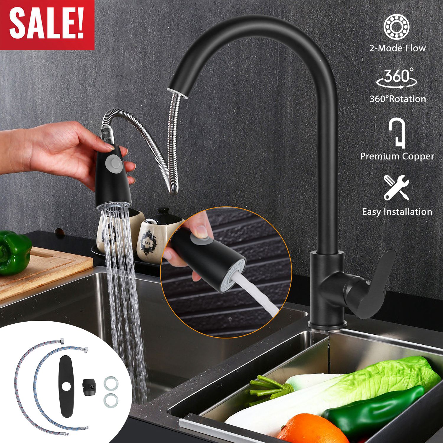 Our Kitchen Faucet adopts high-grade copper material, safe, high-heat temperature, abrasion resistant, anti-corrosion and anti-rust. Come with the button on the spout to freely convert two water flow modes (powerful spray mode and steady stream mode) according to your needs. Besides, you can decrease your time to do a convenient cleaning with its 360°rotatable and flexible head to increase water cover range.