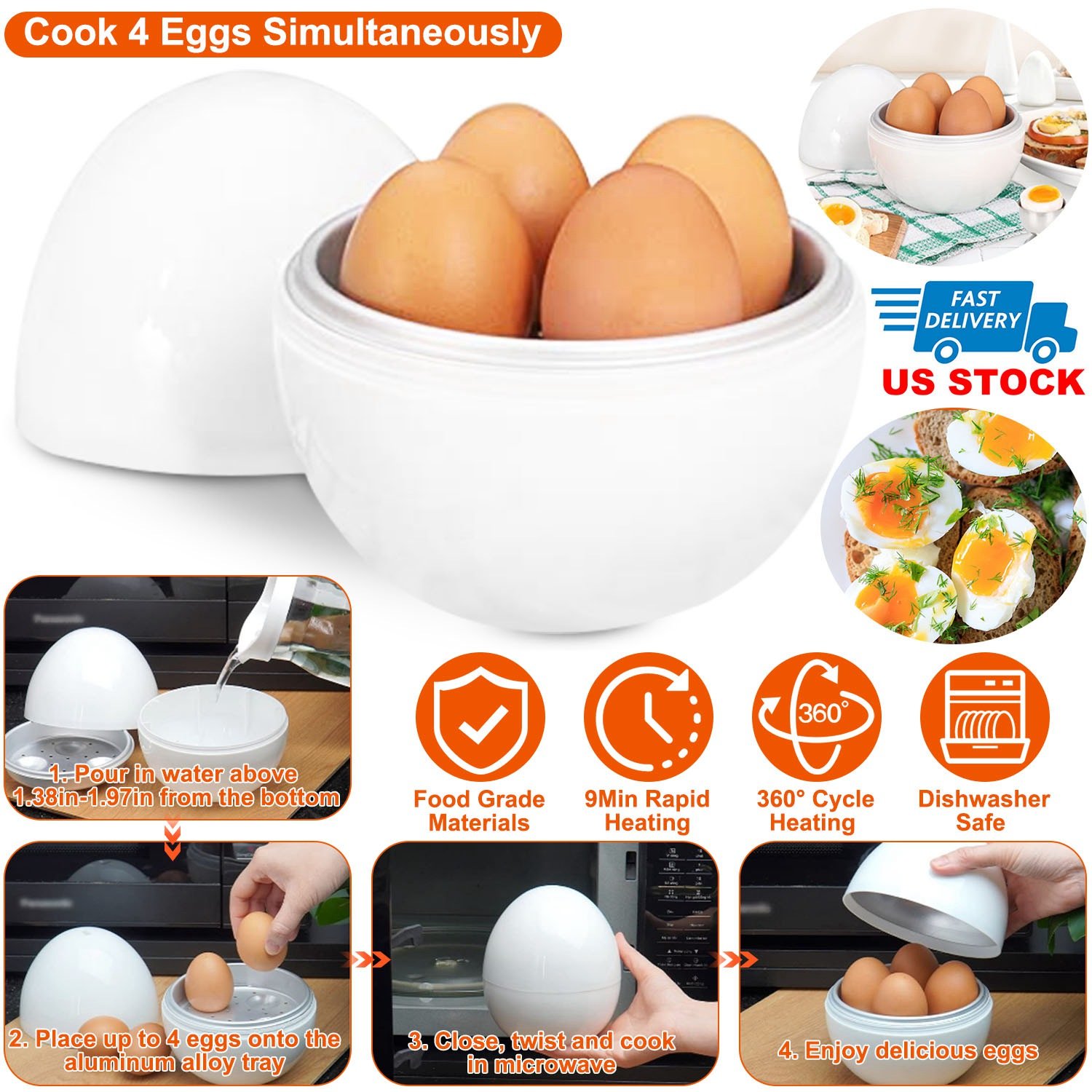Are you still worrying about having no time to make breakfast in a hurry morning? Let this microwave egg cooker help you make a nutritious one. It can boil 4 eggs in the microwave within 9 minutes while you are brushing teeth or changing clothes. It is really saves time. Cleaning up with no fuss. No need to worry about using stovetop with pots and boiling water. No need for piercing. Perfect for breakfast and meal prep for your family and friends. Dish washer safe saves you much time to clean up. Ultra-lightweight and save space when not in use.