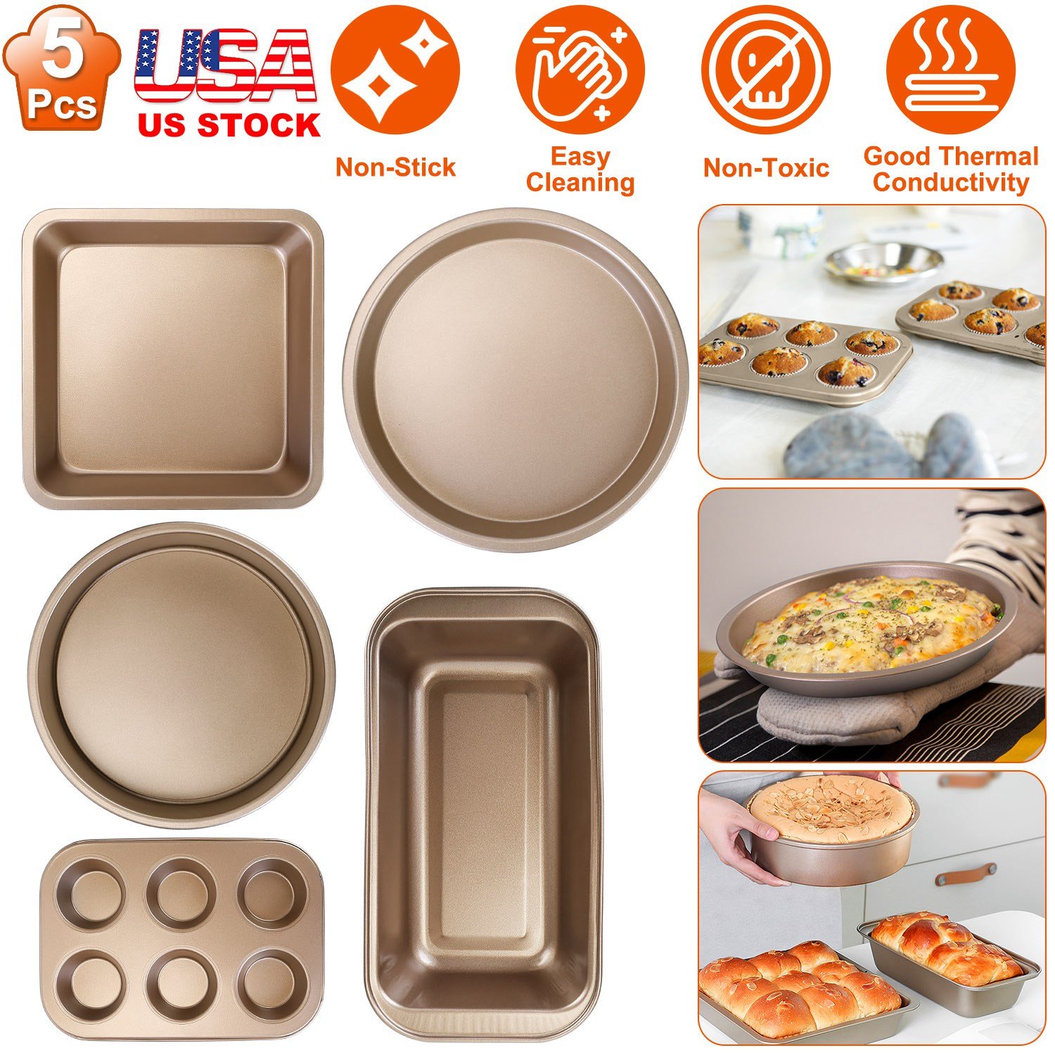 5Pcs Nonstick Bakeware Set Baking Tray Ovenware Sheet Kit w/ 6-Cup Muffin Pan Square Pan Loaf Pan Pizza Pan Live Bottom Round Cake Pan
