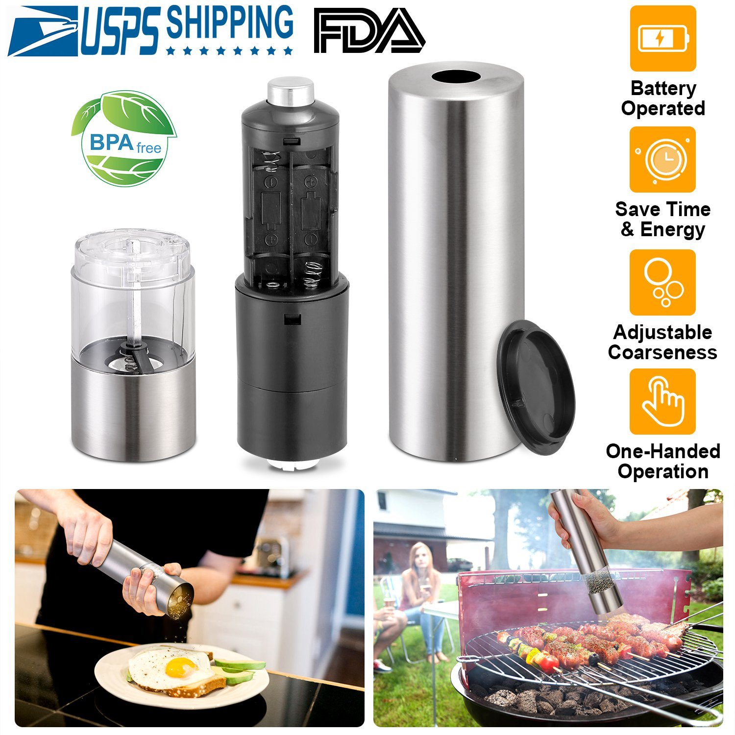 Still manually grind pepper, which waste time and energy? Our electric salt & pepper grinder is battery operated to save your time and energy, incredibly easy to use with their smart one-hand design so you can season your food with just the push of a button. Also it's economical and practical, ideal for cooking in the kitchen and grilling BBQ outside. Meanwhile, made of the highest quality stainless steel and BPA-free acrylic glass, which is safe to use and also a stylish addition to your kitchen and dinner table. Feature coarseness adjustment, which makes it easy to adjust the coarseness for perfect grind and seasoning.