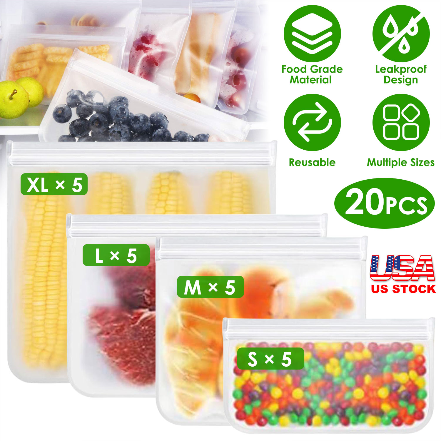 Home > 20Pcs Reusable Food Storage Bags 5 Sandwich Snack Gallon Quart Bag Leakproof BPA Free Food Container Freezer Safe Lunch Bag