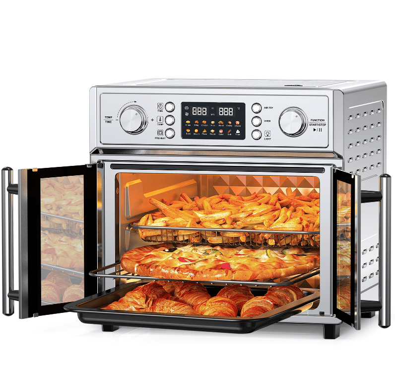 SKU: W1002P401550 Pizza Oven Bread Machine Oven 26QT Large Capacity French Double Door Air Fryer 1700w 14 Preset Menus 7-in-1 Multifunctional for baking, baking, grilling, toast, dehydration defrost, defrost, stainless steel, Smart Oil Free Cooking Air Oven Separate Oil Filter 360 ° Air Circulation Timer and Non-Stick Low Fat Cooking Mechanical Knob Non-Stick Strainer Basket Insulated Anti-Scalding Handle Porous Heat Dissipation.