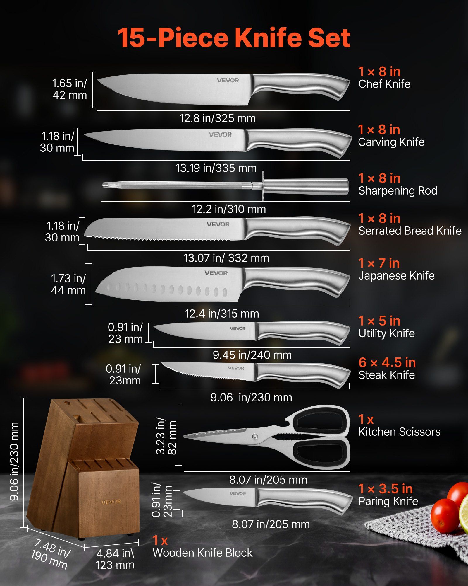 VEVOR Kitchen Knife Set with Block and Sharpener, 15 Piece German High Carbon Stainless Steel Sharp Knife Set, Kitchen Cutlery with Ergonomic Handle VEVOR Kitchen Knife Set with Block and Sharpener, 15 Piece German High Carbon Stainless Steel Sharp Knife Set, Kitchen Cutlery with Ergonomic Handle VEVOR Kitchen Knife Set with Block and Sharpener, 15 Piece German High Carbon Stainless Steel Sharp Knife Set, Kitchen Cutlery with Ergonomic Handle