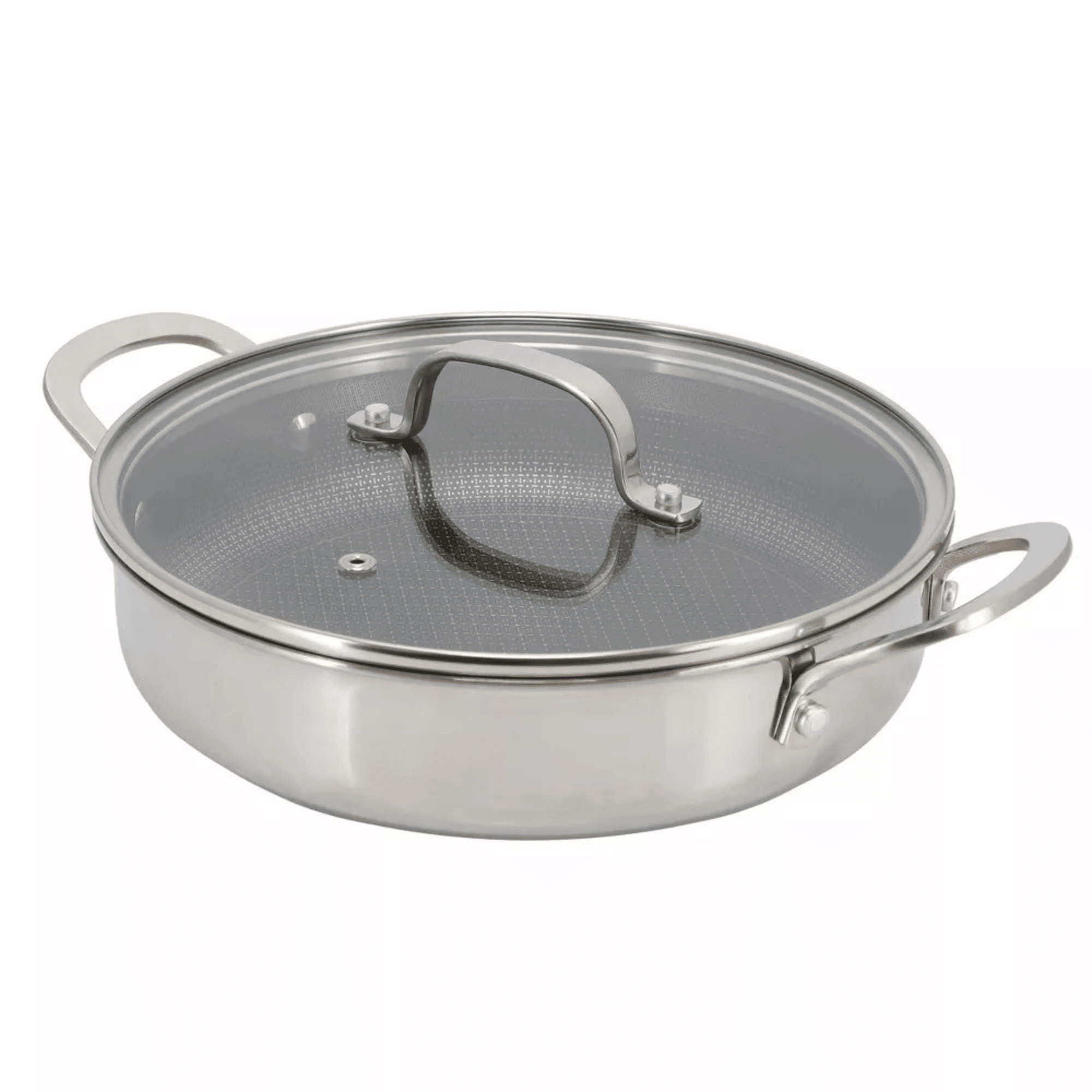 Elevate your kitchen with the Better Chef 9-Inch 3-Ply Stainless Steel Nonstick Deep Fry Pan with Lid in a sleek silver finish. Built for both performance and style, this versatile pan features a PFOA-free nonstick surface that makes food release effortless and is safe to use with smooth-edged metal utensils. Its triple-layer stainless steel design ensures even heat distribution - ideal for everything from frying and sauteing to searing. The double-riveted handle provides a sturdy, comfortable grip, and the included tempered glass lid helps seal in moisture and flavor. Compatible with all stovetops - including induction, gas, electric, halogen, and vitroceramic - this pan is oven-safe up to 500F (or 350F with the lid), making it easy to move from stovetop to oven. While it's dishwasher safe for quick cleanup, hand washing is recommended to extend its life. Whether you're whipping up a weekday meal or experimenting with new recipes, this deep fry pan is a kitchen essential.