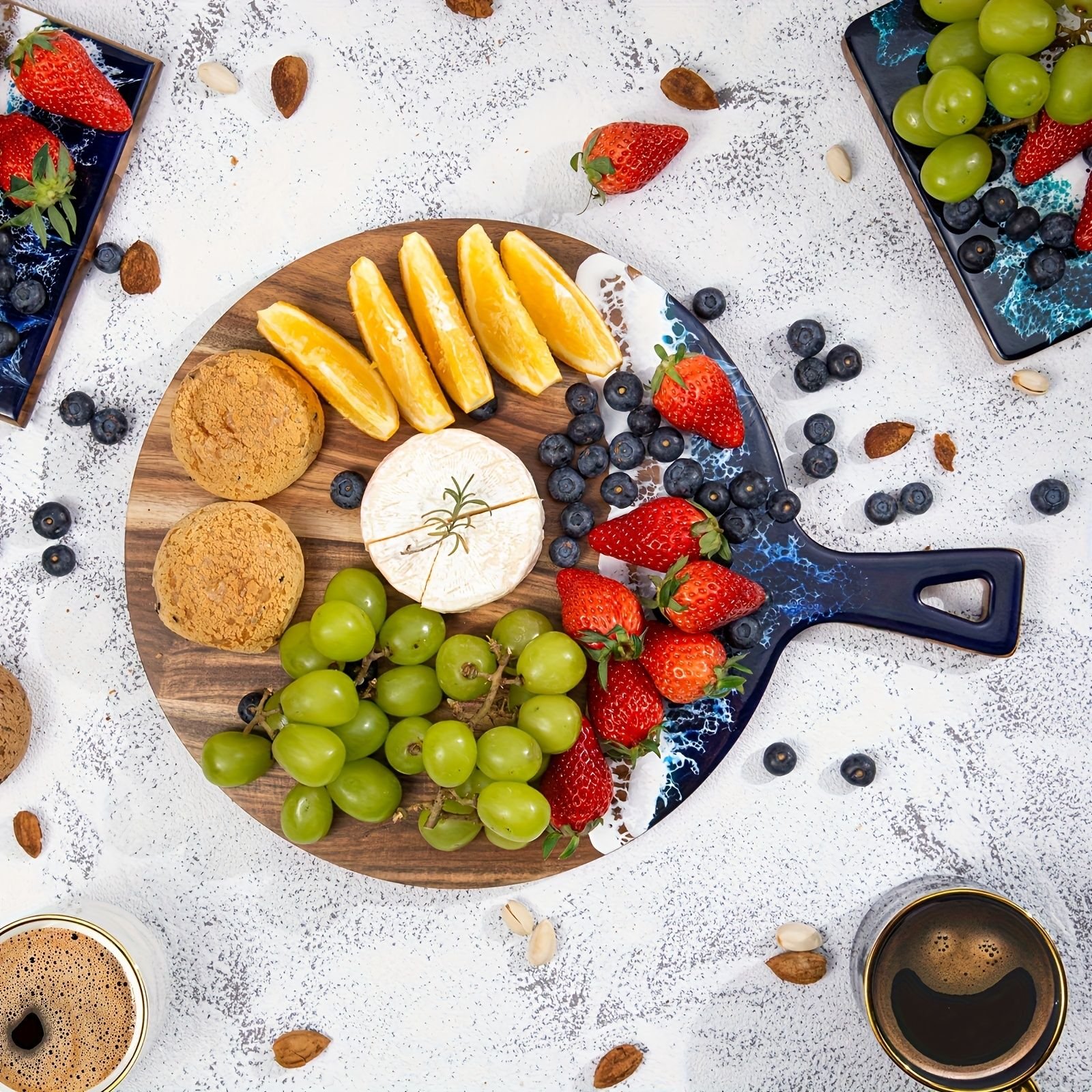 Round Acacia Wood & Resin Charcuterie Board with Handle - Natural Wood Grain Surface, Non-Porous Durable  for Meat, Bread, Cheese Round Acacia Wood & Resin Charcuterie Board with Handle - Natural Wood Grain Surface, Non-Porous Durable  for Meat, Bread, Cheese Round Acacia Wood & Resin Charcuterie Board with Handle - Natural Wood Grain Surface, Non-Porous Durable  for Meat, Bread, Cheese